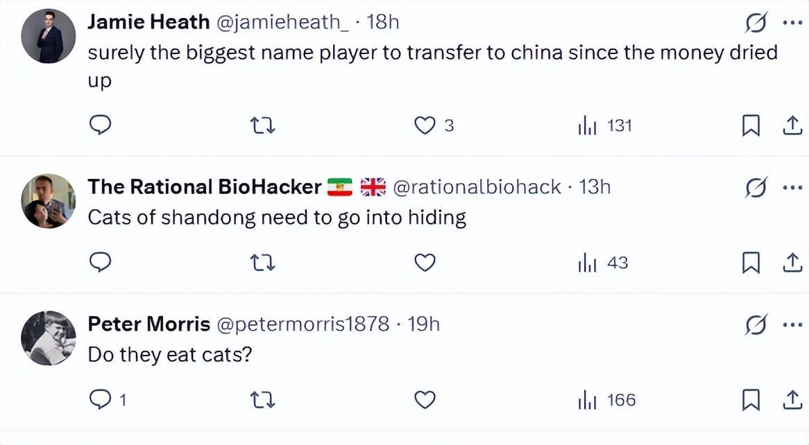 正因如此,祖马加盟山东泰山的消息引起了欧洲球迷的兴趣,但也多是以嘲讽和奚落为主。在祖马可能前往中国踢球的消息下方,有法国球迷评论称:“一个虐猫的人去中国踢球并不奇怪。”还有英国球迷表示:“山东的猫们现在要注意安全了。”“真巧,祖马现在能尝尝猫肉了。”